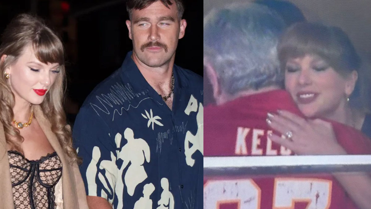 Though she entered the stadium privately, Swift was later captured on camera by NBC Sports. In one heartwarming clip, the singer was seen hugging her future father-in-law, Ed Kelce. Dressed in an oversized Chiefs jersey, her hair in a ponytail, Swift’s dazzling old mine brilliant cut diamond engagement ring was also on full display. She was seen chatting with Ed and WNBA star Caitlin Clark during the game.
